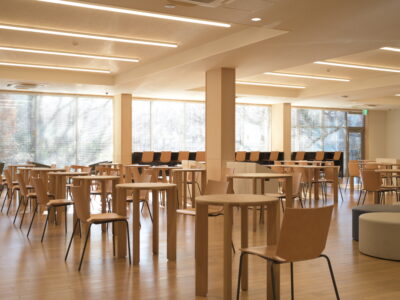 - 豊かな緑を背景に、学生・教職員・地域住民が交流できる屋内スペース。